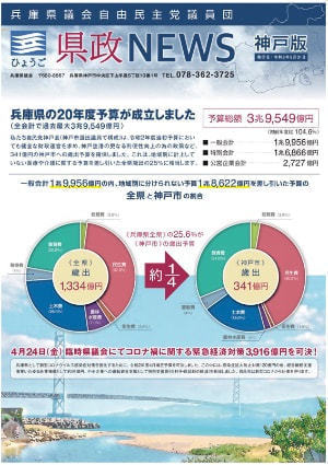 兵庫県の予算は約4兆円、歳出で比較すると全国5位の規模です。そのうち神戸市に一体いくら使われているのか、県の裁量で地域別に配分しようとしている1334億円のうち約25%の341億円が神戸市に充てられています。神戸市の予算1兆8千億円に占める割合は2%にも満たない額ですが、神戸市が毎年財政調整基金(内部留保)に回す額は、100億円~200億円ですので、これが無かったら大変なことになります。県予算を身近に感じて頂きたいと思い、この様な数字を公開しました。2面3面は、私の個人報告。4面はコロナ禍セイフティーネット融資などについて記載しております。